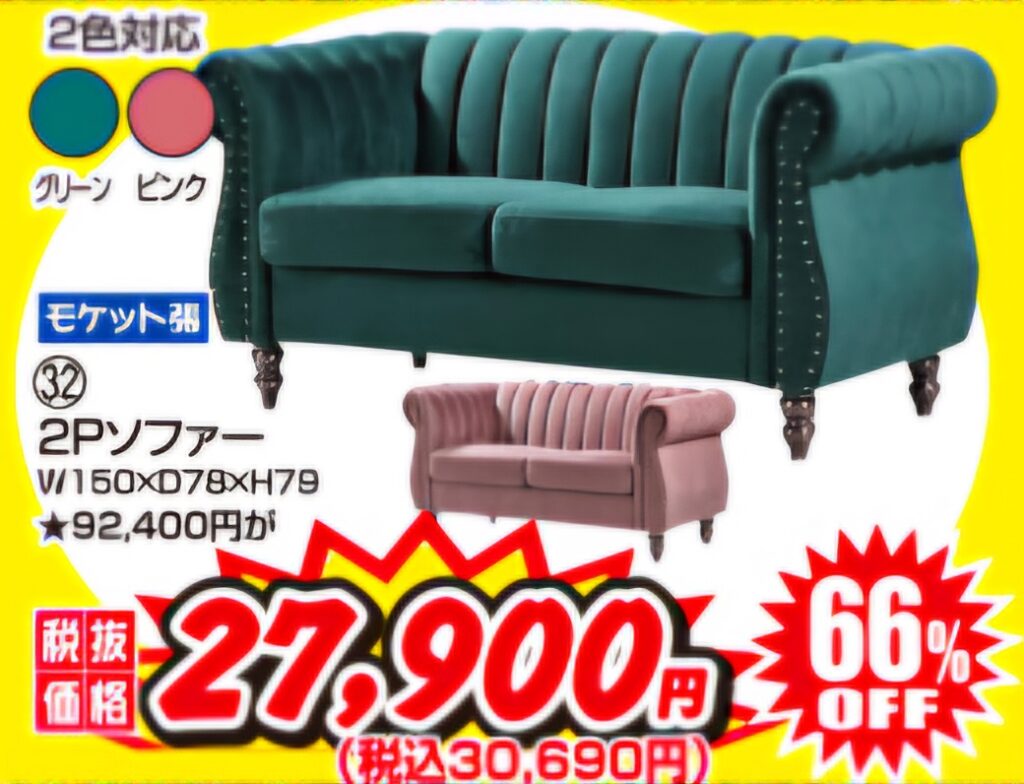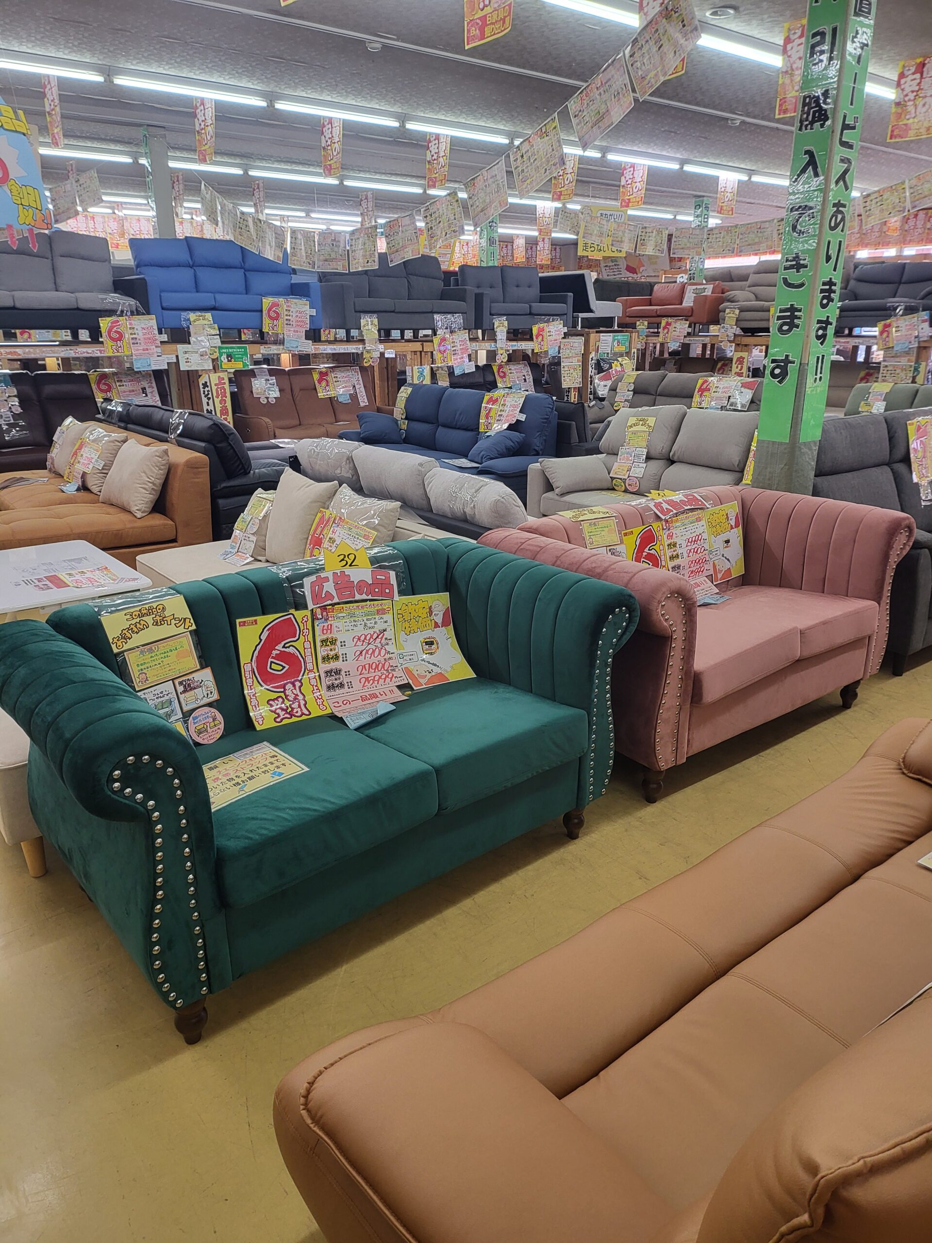 クリスマスシーズンに ピッタリの ベルベット生地の2人掛けソファー🎶🎶¥7,999(税抜現金会員価格)などなど