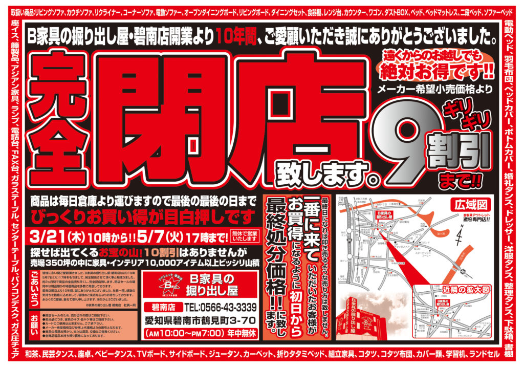皆様に永い間ご愛嬌頂きました、B家具の掘り出し屋・碧南店は、 2019年 5月7日(火) 17時をもちまして、完全閉店させていただく事と相成りましたm(__)m