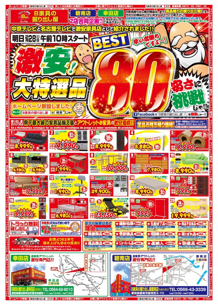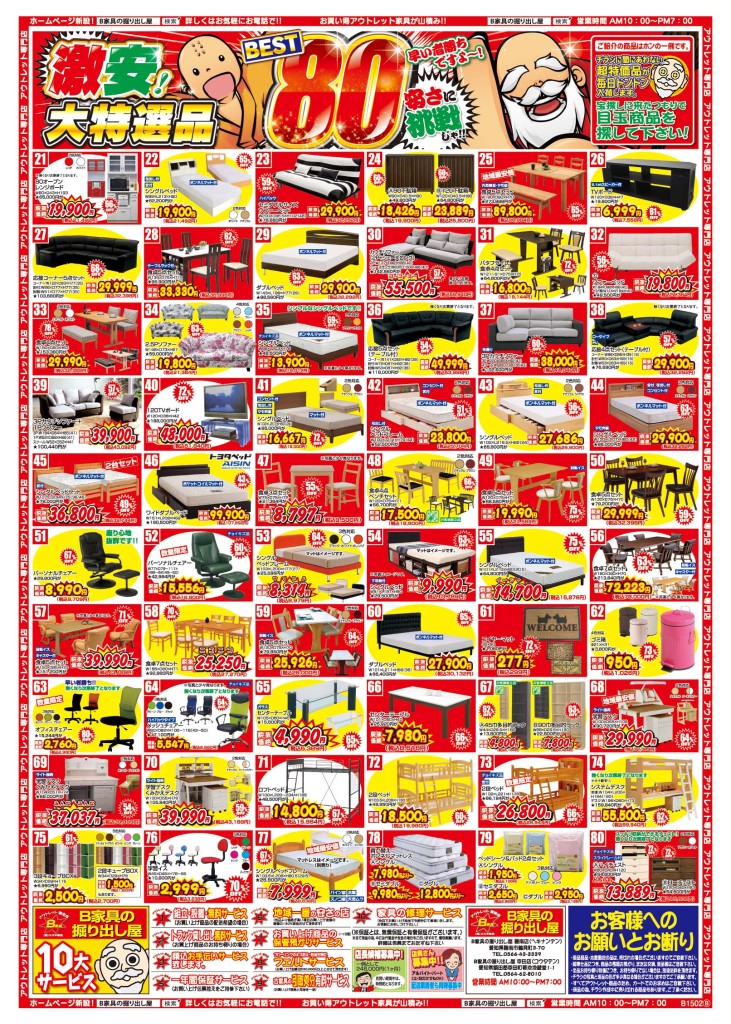 B家具の掘り出し屋は、人気商品ばかりを選んで 激安!!大特選!!BEST80セールを開催中です。