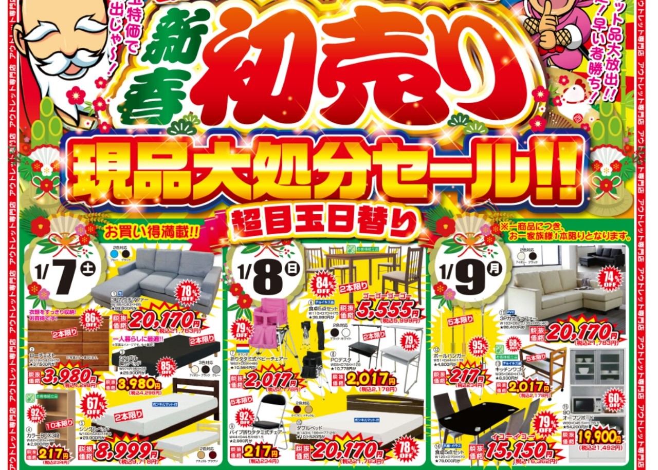 元旦より 大好評の!! 初売り 現品大処分セーール!!!
