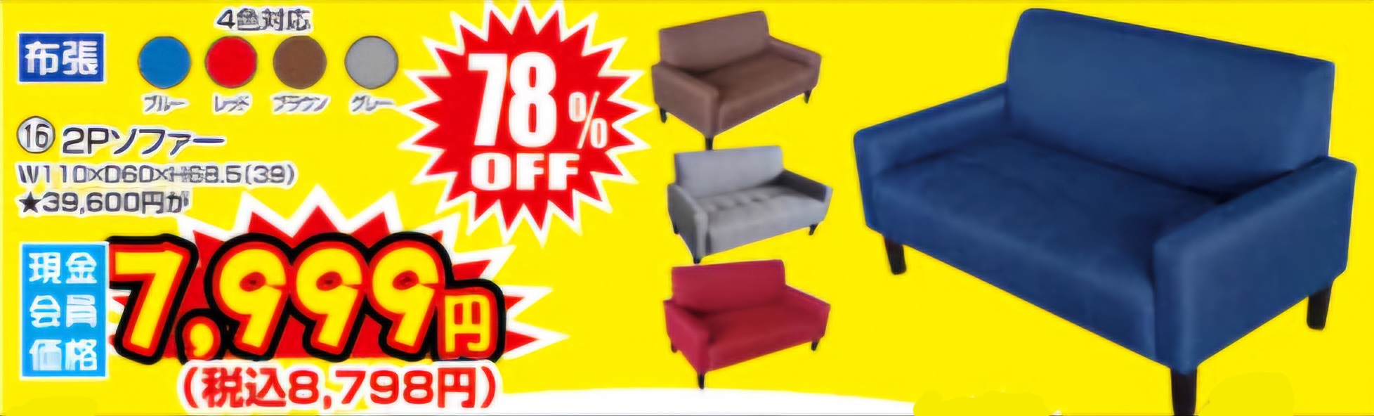 2人掛けソファー 現金会員価格 税抜 ¥7,999
