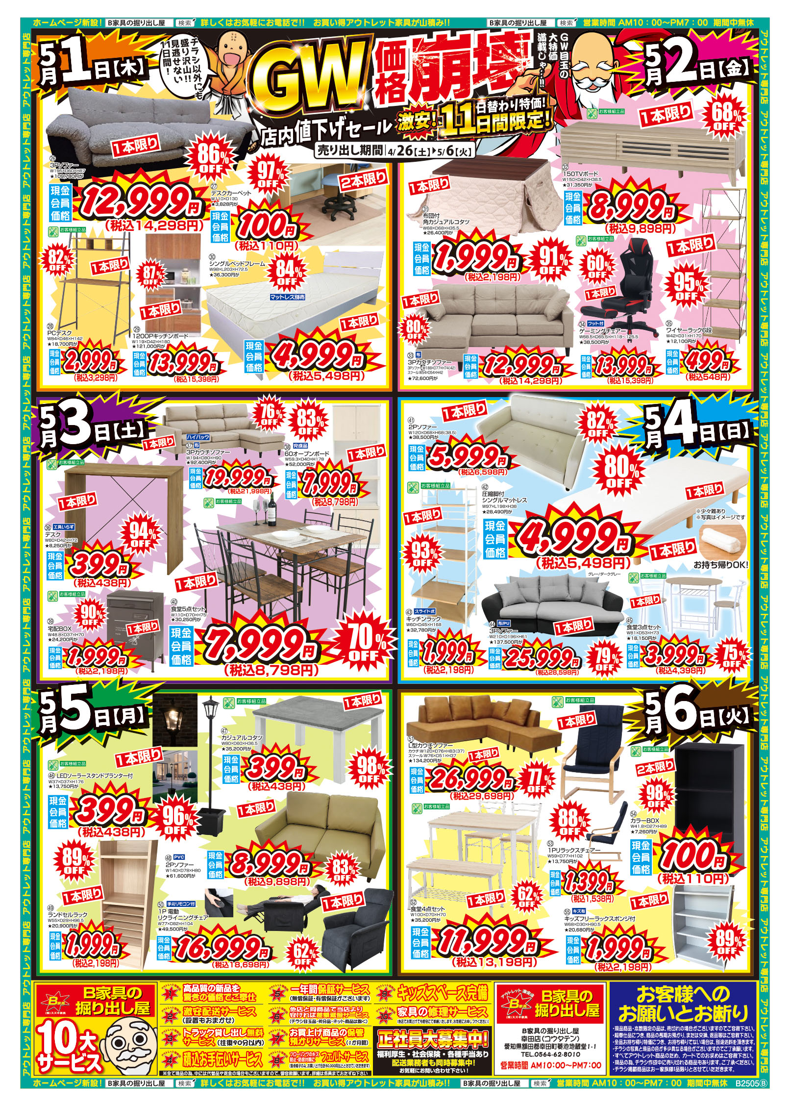 B家具の掘り出し屋の 毎日日替り✨✨ GW 価格破壊セーールは、
