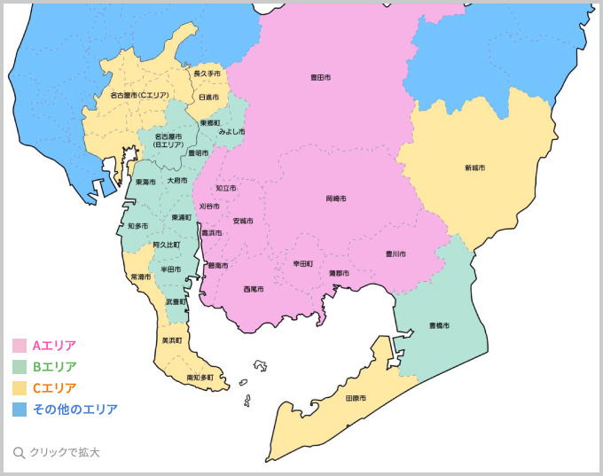 - 名古屋市(Bエリア以外の区)・日進市・長久手市・常滑市・美浜町・南知多町・新城市・田原市