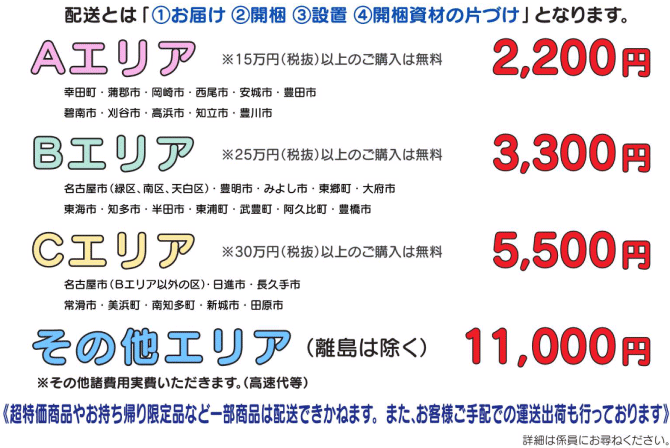 - ■Aエリア・・・配送料税抜2,000円(税込2,200円) ※15万円(税抜)以上のご購入は無料