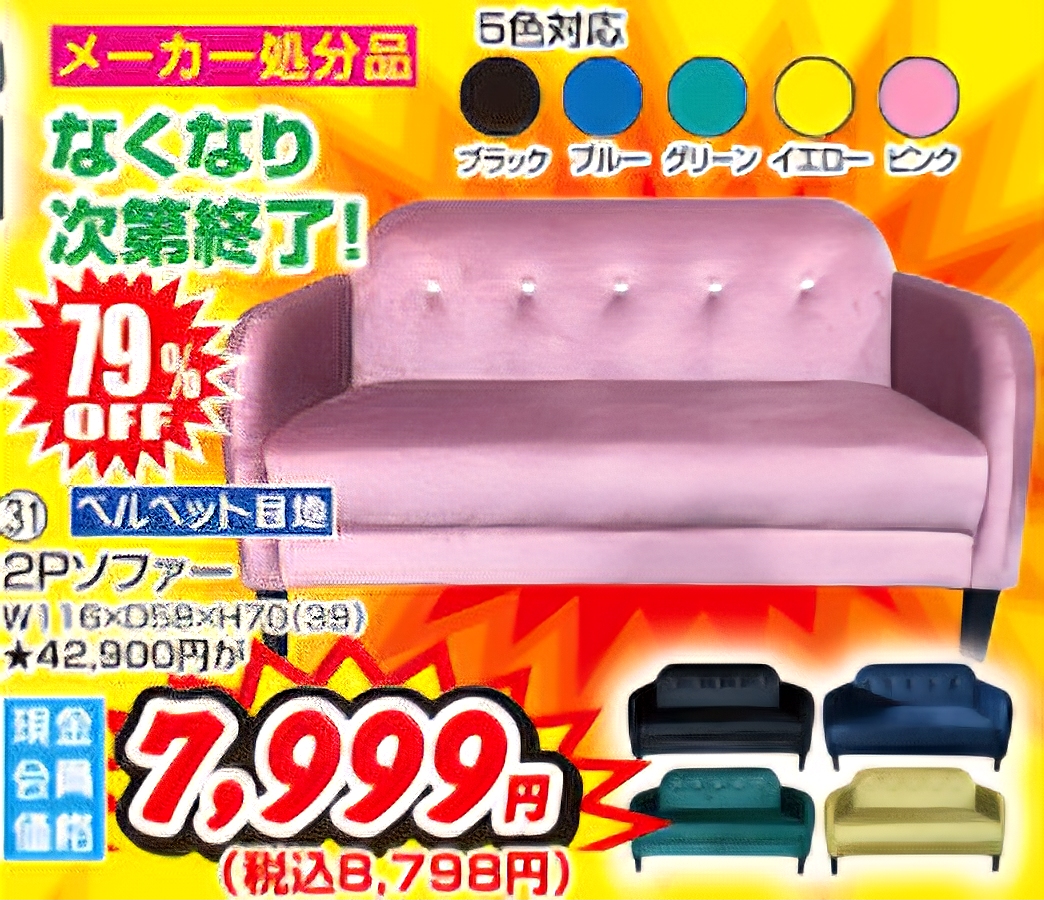 クリスマスシーズンに ピッタリの ベルベット生地の2人掛けソファー🎶🎶¥7,999(税抜現金会員価格)などなど